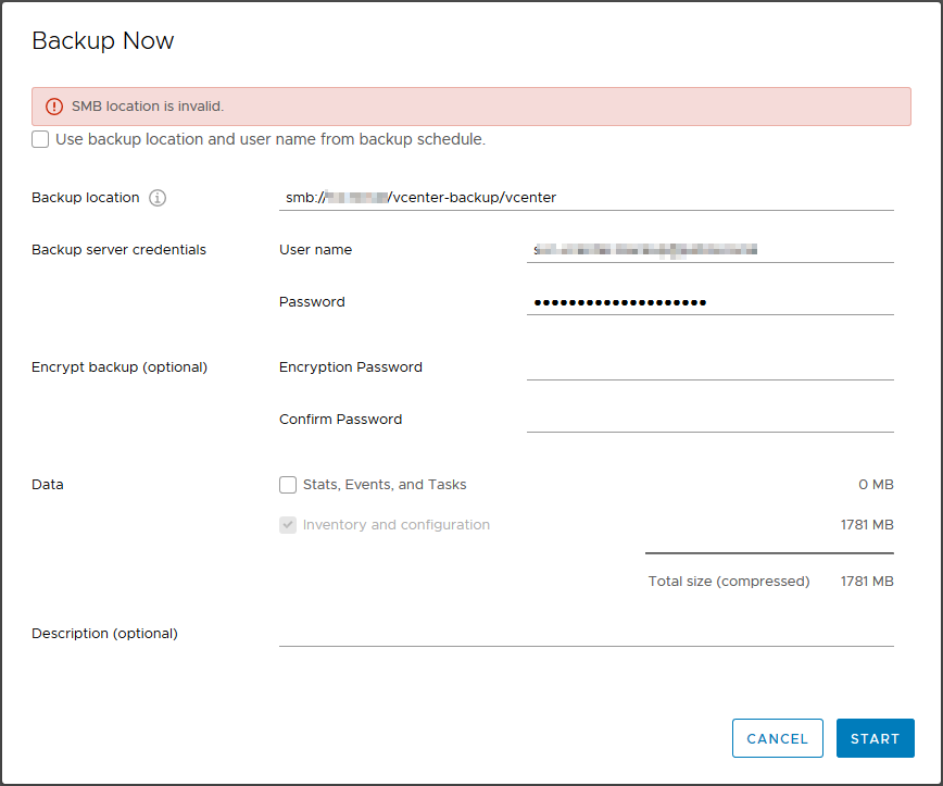 Message SMB location is invalid obtenu lorsque l'on essaie de configurer un partage SMB comme destination de sauvegarde de la configuration d'une appliance vCenter 6.7 U3.